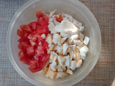 В глубоком, удобном для перемешивания салатнике соедините куриное филе, помидоры, вареные яйца и сыр.