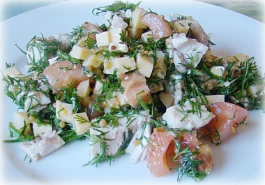 Нашла такой простой рецепт салата грудка куриная, сыр и помидоры. Как раз курица вареная лежала в холодильнике, не знала, куда пристроить
