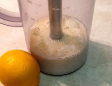Аккуратно опустите ножку блендера так, чтобы "юбочка" накрыла желток. Взбейте яйцо с маслом до получения однородной светлой массы. Всыпьте в стакан сахар и соль, влейте лимонный сок. Количество соли и сахара можно регулировать на свой вкус. Снова пробейте массу блендером, чтобы размешать все ингредиенты.