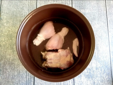 Через час готовую курицу вынуть, разделать. Кожу и кости выбросить.