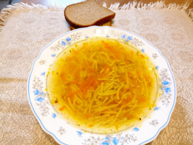Для меня куриный суп с вермишелью в мультиварке просто идеальное блюдо. Я вообще люблю готовить в мультиварке, особенно, когда нет времени стоять у плиты. Да и по вкусу блюда из "мультяшки" какие-то другие. Куриный суп - это палочка - выручалочка. И быстро, и вкусно, легко и полезно. Курицу я брала не целую, а только крылья и хребет, для нас и такой бульон сытный. Картошку не использовала. Заправила любимыми специями, добавила немного сушеного чеснока и стебли петрушки и укропа для аромата. Муж попробовал и сказал только одно слово: "Душевненько!" Собственно, этим всё и сказано. Спасибо за рецепт, готовьте с удовольствием!