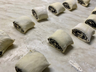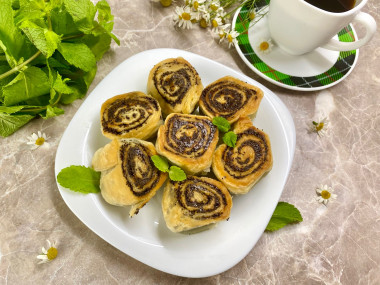 Увидела рецепт Булочек с маком из слоеного теста. Рецепт показался очень простым и быстрым. То, что нужно, когда хочется чего-то к чаю, но не хочется сильно заморачиваться. Как указано в рецепте, разморозила слоеное тесто. Для начинки смешала мак, сахар и сливочное масло. Раскатала пласт теста, выложила начинку и свернула в рулет. Нарезала на равные кусочки и выложила на противень. Выпекала, как указано в рецепте. Булочки получились очень ароматными, мягкими и очень вкусными. Буду готовить еще!