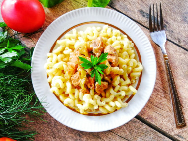 Мясо я тушила до мягкости, по времени - больше, чем в рецепте. Подливка в процессе готовки немного загустела, стала насыщенная, аппетитная. Болгарский перец потушился до мягкости, отдал подливке свой аромат. Подавала свинину с макаронами, получилось очень вкусно!