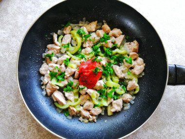 Сливки в подливку я не добавляла, вместо них взяла большее количество воды. Паприку я также не добавляла. Нарезала немного петрушки, добавив ее на сковороду вместе с томатной пастой. Петрушка очень ароматная, она придаёт блюду мягкий привкус, всегда добавляю ее в супы, иногда во второе.