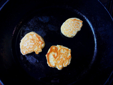 Тесто у меня получилось густое, даже, наверное, слишком, но разбавлять я его ничем не стала. Жарила оладьи на чугунной сковороде на самом маленьком огне по 2 минуты с каждой стороны.