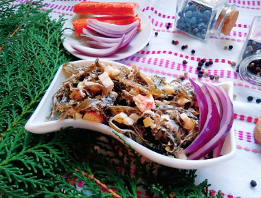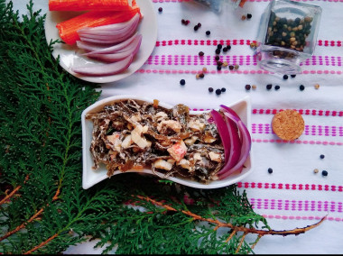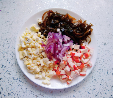 Морскую капусту мы любим в любом виде, а в салатах тем более. Недавно готовила салат тоже с использованием водорослей и у меня осталась приличная порция. Морская капуста у меня была сушеная, я ее предварительно замочила и немного отварила. В таком виде она совсем пресная, поэтому пока подготавливала остальные ингредиенты салата, замариновала капусту в смеси соли, сахара и специй для корейской моркови. Яйца и крабовые палочки мелко нарезала, фиолетовый лук тоже измельчила. Майонез заменила на домашний соус. Получился очень вкусный салат! Морская капуста успела пропитаться специями, стала немного остренькой, лук тоже придает сладко-острый вкус. А яйца и крабовый палочки более нейтральные. Удивительно разнообразный по вкусу, питательный и полезный салат. Спасибо!