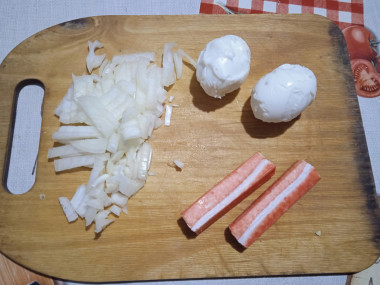 Сложите в миску капусту, крабовые палочки, яйца и лук. Если в капусте слишком много жидкости, то предварительно откиньте ее на сито.