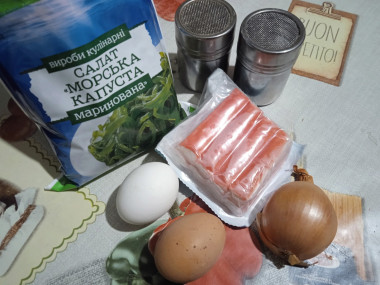 Как сделать салат из морской капусты с крабовыми палочками и яйцом? Подготовьте продукты. Морскую капусту я взяла готовую, в виде консервы, в ней нет в составе ни масла, ни других добавок, только соль и специи. Крабовые палочки у меня охлажденные. Если у вас замороженные, то предварительно разморозьте их. Яйца надо заранее отварить в течении 7-9 минут и полностью остудить. Если у вас нет фиолетового лука, то возьмите обычный.