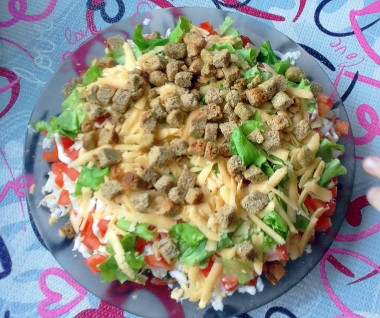 Рекомендую салат перемешивать непосредственно перед подачей, тогда сухарики останутся хрустящими.