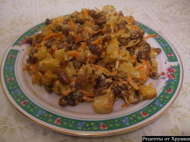 Салат с курицей фасолью и сухариками наш любимчик, особенно хруст сухариков. А какая вкусненькая в нем обжаренная курочка, ммммм! В общем, девочки, готовьте и пробуйте, это стоит того!