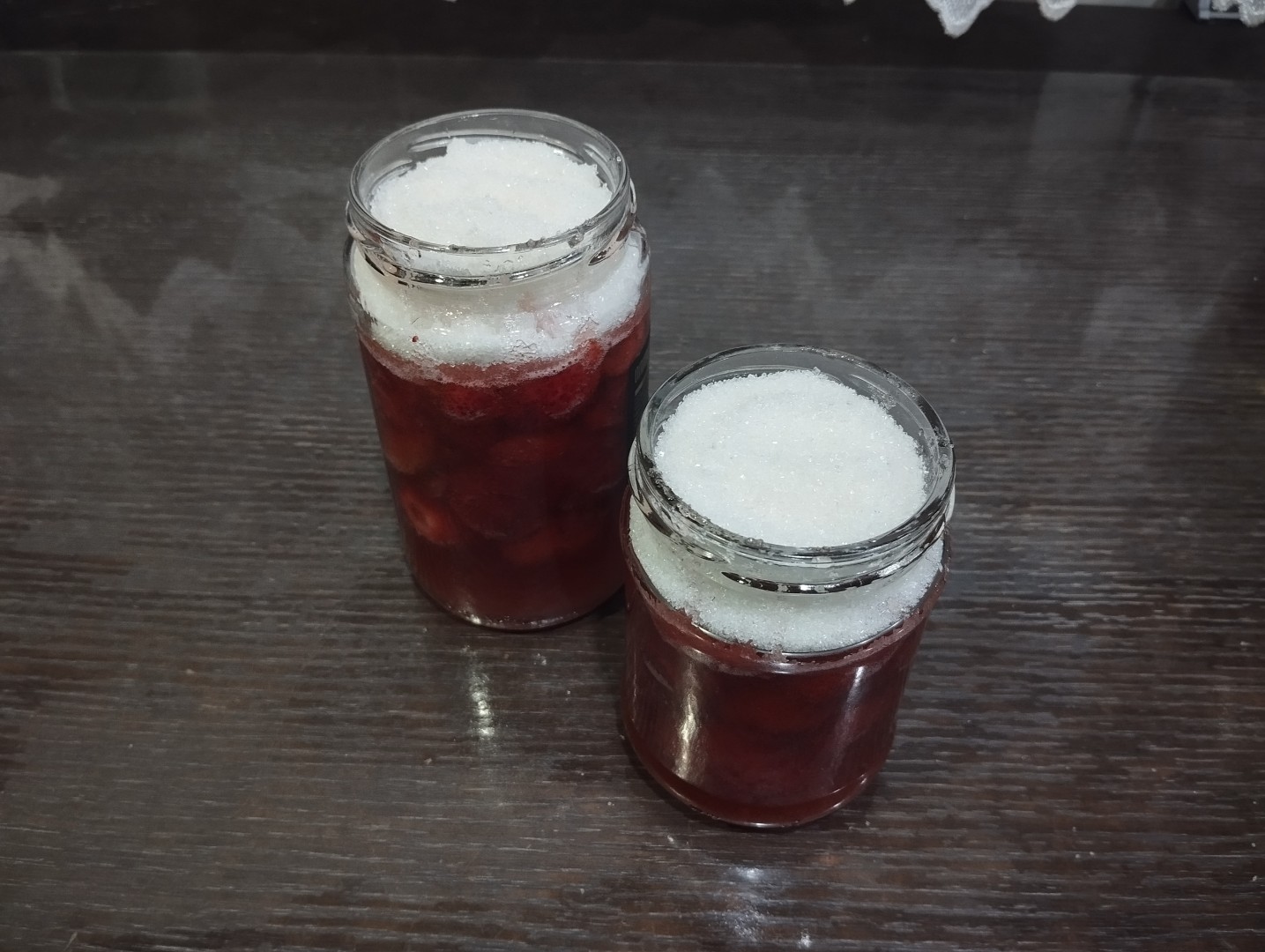 Сверху на ягоды насыпьте по 2-3 столовые ложки сахара из того, который оставляли отдельно. Благодаря этому целая клубника в сиропе будут долго хранится.