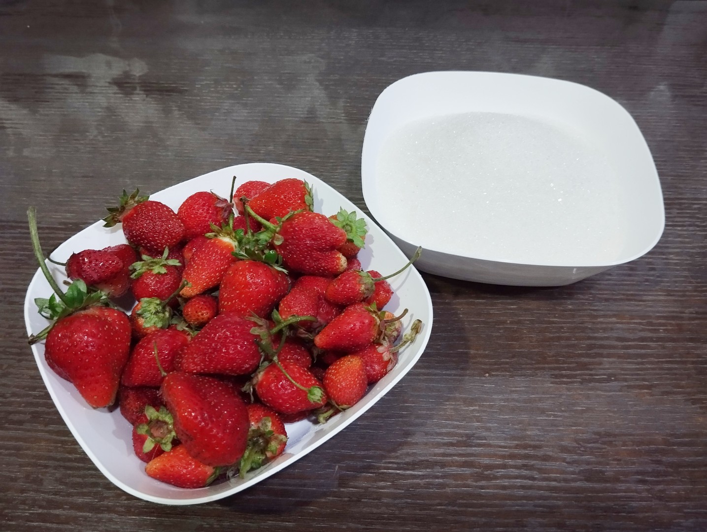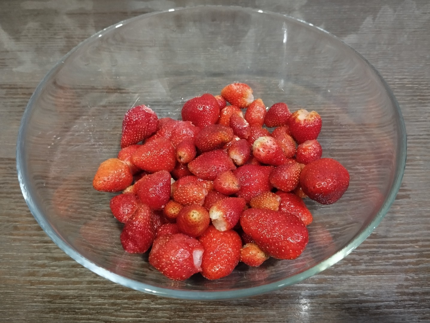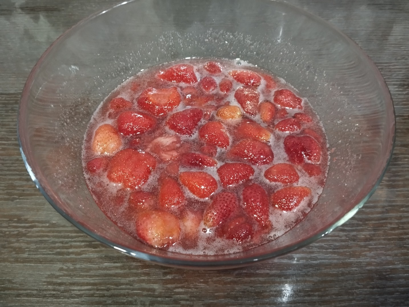 Очистите клубнику от плодоножек и листиков. На дно чаши насыпьте немного сахара и выкладывайте ягоды, пересыпая их сахаром. Немного сахара (примерно 150 грамм) отложите. Он нам понадобится чуть позже. Оставьте ягоды постоять на несколько часов, чтобы они пустили сок. Немного их перемешивайте, чтобы сахар растворялся в сиропе.