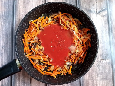 Влейте к овощам томатную пасту предварительно разбавленную водой. Сколько воды использовать? Всё зависит от того на сколько густое блюдо вы в итоге хотите получить. Вместо томатной пасты можно использовать томатный сок или кетчуп. Всё посолите по вкусу, поперчите и добавьте щепотку сахара. На данном этапе можно использовать любимые сухие специи и приправы.