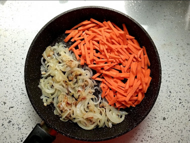 Репчатый лук нарежьте тонкими перьями, а морковку натрите на тёрке с крупными зубками. Морковь допустимо измельчить тонкими брусочками от руки или воспользоваться овощерезкой для корейских салатов. Помните о том, что если вы натрёте морковку слишком мелко, то она превратится в кашу в готовом блюде.