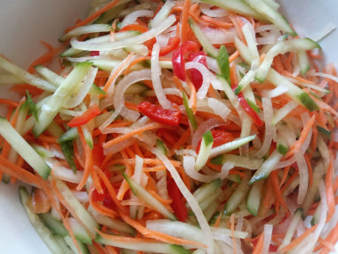 Все нарезанные овощи перемешать, посолить, положить сахар, добавить уксус 2-3 ст.л. или чуть-чуть эссенции - овощи помять, чтобы дали сок (сильно мять не надо, а то станут совсем мягкими).