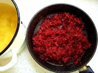Разогрейте на сковороде растительное масло и обжарьте на нём лук, морковь и свеклу.