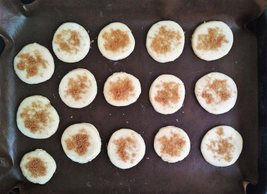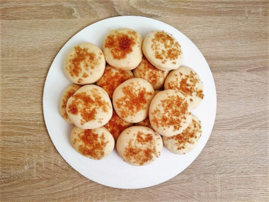 Противень смазываем растительным маслом и выкладываем печенье. Во время выпекания оно немного увеличится в размере, поэтому нужно выкладывать его на расстоянии друг от друга. Духовой шкаф разогреваем до 180 градусов. Выпекаем печенье около 25 минут. Когда печенье зарумянится, вынимаем его из духового шкафа.