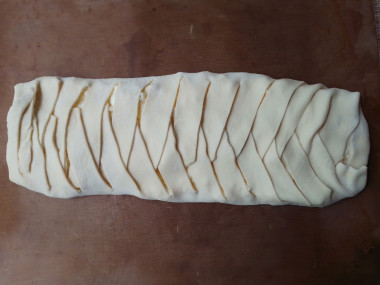 С обоих концов (с длинных сторон) сделайте надрезы под углом, но не доходя до центра. В центр выложите творожную начинку.