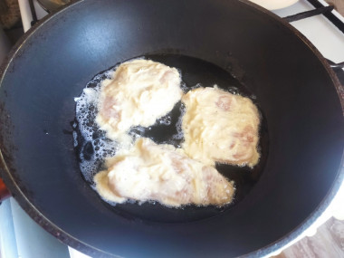 В сковороде разогрейте растительное масло. О том, как подобрать идеальную сковороду, а также как правильно выбрать растительное масло, читайте в отдельных статьях, ссылки в конце рецепта. Выложите кусочки курицы на сковороду кляром вниз. Жарьте мясо около 10 минут на среднем огне.