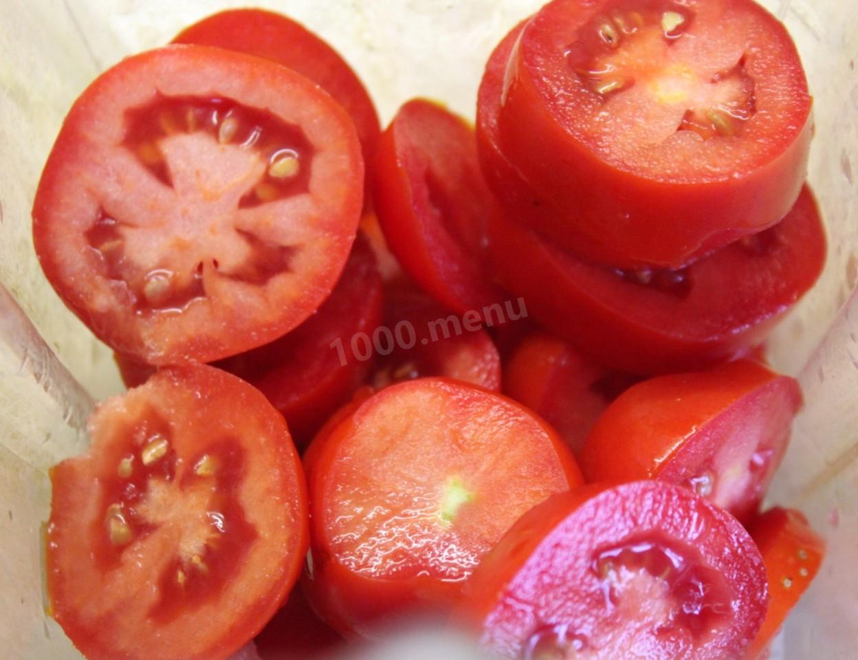 У помидоров удалите плодоножку. Порежьте помидоры на небольшие кусочки, удобные для измельчения в блендере. Сложите их в чашу блендера и измельчите в пюре. Также можно воспользоваться кухонным комбайном или мясорубкой, но консистенция томатов будет не такой гладкой. Перелейте томатное пюре в кастрюлю.