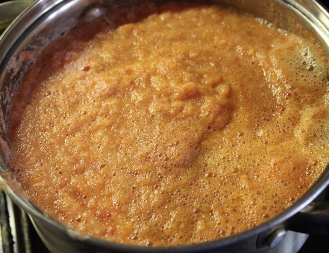 Поставьте кастрюлю на огонь. После закипания варите овощное пюре около 30 минут, помешивая время от времени. Точное время зависит от особенностей вашей плиты. Будьте аккуратны, у меня пюре сильно булькало, поэтому, когда будете мешать икру, прикрывайтесь крышкой. Подробнее о выборе кастрюли для варки читайте в статье по ссылке под шагами.