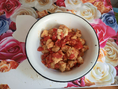Влейте в сковороду пару ложек воды, в которой варились ньокки. Посолите и поперчите соус, я еще добавила щепотку сахара, чтобы нейтрализовать кислоту томатов. Проварите его несколько минут до полного размягчения помидоров.
