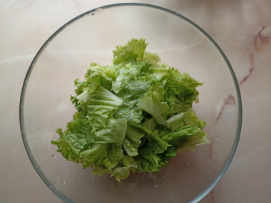 Хорошо промойте листья салата под проточной водой. А затем тщательно обсушите. Очень удобно сушить зелень в специальной центрифуге, в ней листья получаются совершенно сухие. Но если у вас нет такой, то промокните их бумажными полотенцами. Не оставляйте зелень в мокром виде — она быстро потеряет вид в готовом блюде. Возьмите салатник и порвите в него руками салатные листья. Именно руками — от соприкосновения с металлом салат быстро завянет.