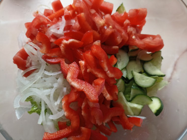 Болгарский перец вымойте, обсушите, удалите семена и плодоножку и нарежьте сначала на колечки, а затем на более мелкие кусочки. Выложите его также в салатник.