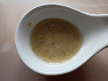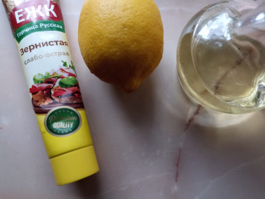 Приготовьте заправку — в пиалке смешайте горчицу, растительное масло и лимонный сок. Горчицу и масло берите любые, главное, чтобы вам нравился их вкус. Количество лимонного сока варьируйте сами. Также можете добавить немного жидкого меда.
