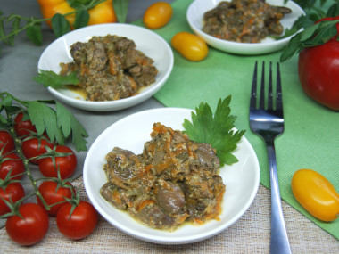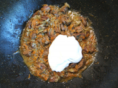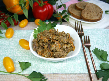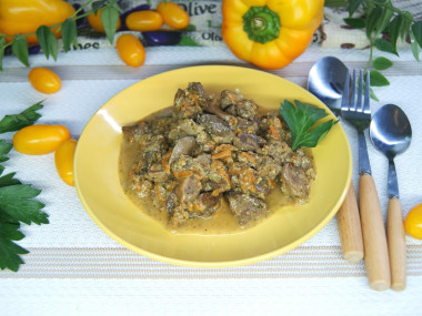 Снова закрываем сковороду крышкой и продолжаем тушение еще на 10-15 минут. На дне сковороды должен оставаться густой соус, но жидкости почти не остается в сковороде. Блюдо готово, куриные сердечки, желудки и печень в сметане получаются сочными и нежными на вкус. По желанию готовое блюдо посыпаем рубленной свежей зеленью, а подать куриные потроха можно с любым гарниром: макаронами, крупами или картофелем. Приятного аппетита!