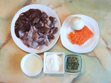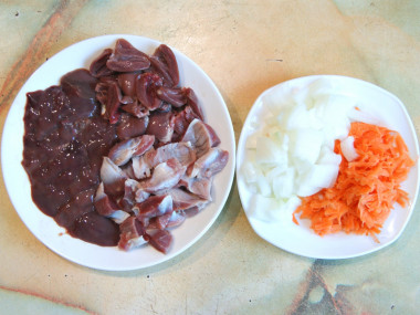 Приготовим ингредиенты по списку. В магазине по довольно-таки низкой цене можно найти набор таких субпродуктов как куриные потроха, который включает в себя куриные печень, сердце и желудки. Это не только вкусные, но и полезные продукты, богатые витаминными и минеральными соединениями. Бывает, кому-то не нравится печень, либо сердце, либо желудки, по желанию нелюбимый продукт можно уменьшить в составе.
