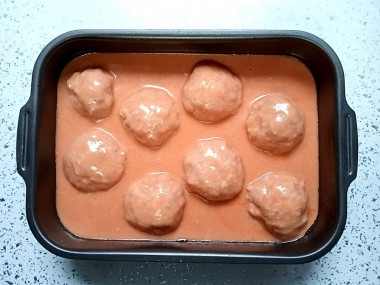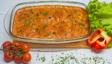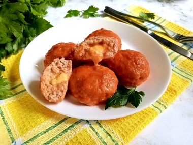 Залейте котлеты с начинкой из сыра томатным соусом и верните в духовку еще на 30-35 минут. Время указано приблизительно и будет зависеть от вашей духовки. Узнать об особенностях работы духовок можно, прочитав отдельную статью, ссылка в конце рецепта.
