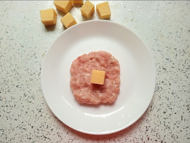 Фарш разделите на 6-8 равных частей и сформуйте ровные круглые котлеты, добавив внутри каждой по кубику сыра.
