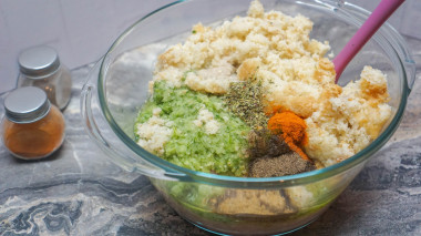 В миске соедините фарш, лук, вымоченный в сливках хлеб, пропущенные через пресс зубчики чеснока и специи.