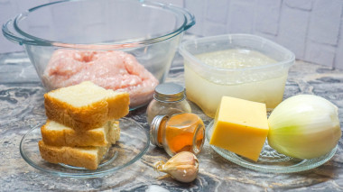 Фарш я накрутила сама из филе куриного бедра. Заодно вместе с мясом прокрутила лук, чеснок и размоченый хлеб. Из специй использовала щепотку свежемолотого перца. Фарш хорошо отбила об миску. Для начинки взяла российский сыр, предварительно попробовала его на вкус и расплавила кусочек в микроволновке.