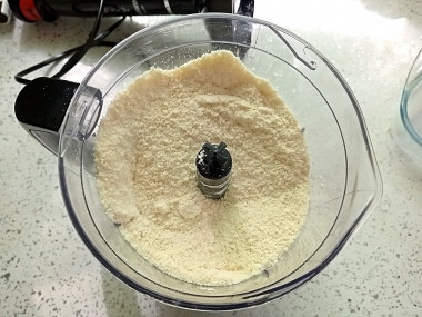 Твёрдое сливочное масло потрите на крупной терке и смешайте с сахаром и мукой. Перетрите все руками. Должна получиться песочная крошка.