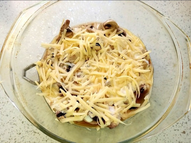 Равномерно распределите поверх запеченных шампиньонов сметанную заливку. Сверху посыпьте также равномерно твердым сыром, натертым на крупной терке.