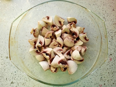 Шампиньоны тщательно промойте, срежьте подпорченные места и самой краешек "ножки", как бы освежая срез. Крупные грибы разрежьте на 4 части, более мелкие - напополам. Положите измельченные грибы в огнеупорную форму в один слой и запеките в духовке при 200 градусах в течение 15 минут.