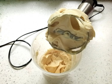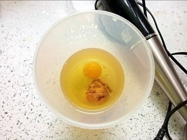 Поместите в чашу погружной блендер так, чтобы он накрыл яичный желток. Включите блендер и вбейте все ингредиенты в течение минуты. Постепенно масса станет густеть и светлеть. Соус станет однородный и достаточно густой.