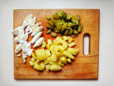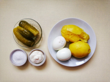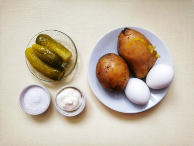 Салат с солёными огурцами, яйцами и картошкой очень напоминает моё любимое оливье, хотя включает гораздо меньше ингредиентов. Для его готовки взяла всего три продукта - картошку, соленые огурцы и яйца. Картошку и яйца сварила, остудила, затем нарезала. Огурцы (у меня были маринованные) также нарезала. После этого всё соединила, посолила и добавила майонез. Как говорится, готовится просто, а получается вкусно! Картошка и яйца сделали салат сытным, а огурчики - пикантным, с приятной кислинкой.