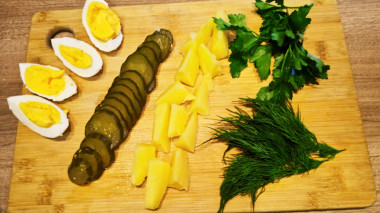 Как сделать салат с солеными огурцами, яйцами и картошкой? Подготовьте продукты. Яйца и картофель помойте. Картофель дополнительно потрите щеткой. Отправьте эти два ингредиента в одну и ту же кастрюлю, ведь они могут прекрасно вариться вместе. Залейте их водой и поставьте на небольшой огонь.