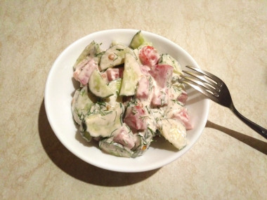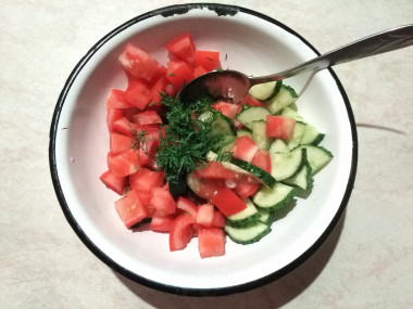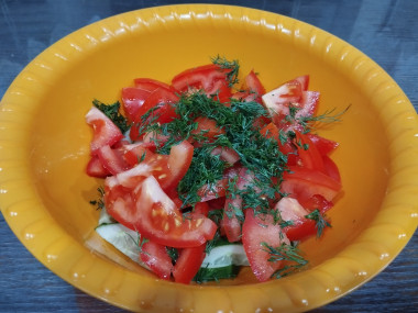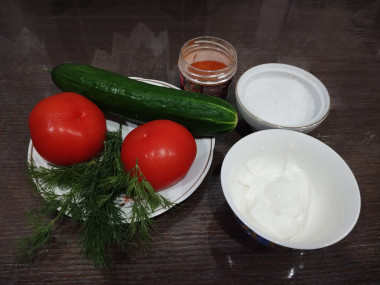 Огурцы порезала полукольцами, помидоры дольками, зелень укропа измельчила. Соединила все ингредиенты,посолила, добавила немного паприки копчёной и заправила сметаной.