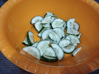 У огурца отрежьте "попки" и нарежьте полукружками. На самом деле, вид нарезки может быть абсолютно любой: могут быть и кружки, и даже кубики. На вкусе это никак не отражается.