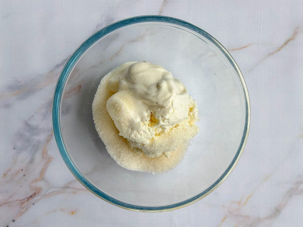 Соедините в миске творог, сметану, сахар, ванильный сахар. Количество сахара и сметаны указано примерное, поскольку все будет зависеть от качества самого творога. Если он зернистый и суховатый, то потребуется положить больше сметаны. С выбором качественного творога поможет статья по ссылке в конце рецепта. Всё перемешайте. Попробуйте и при необходимости отрегулируйте вкус, добавив сметану или сахар.Шаг 4. Как сделать домашнюю творожную массу из творога со сметаной с сахаром нежнее?