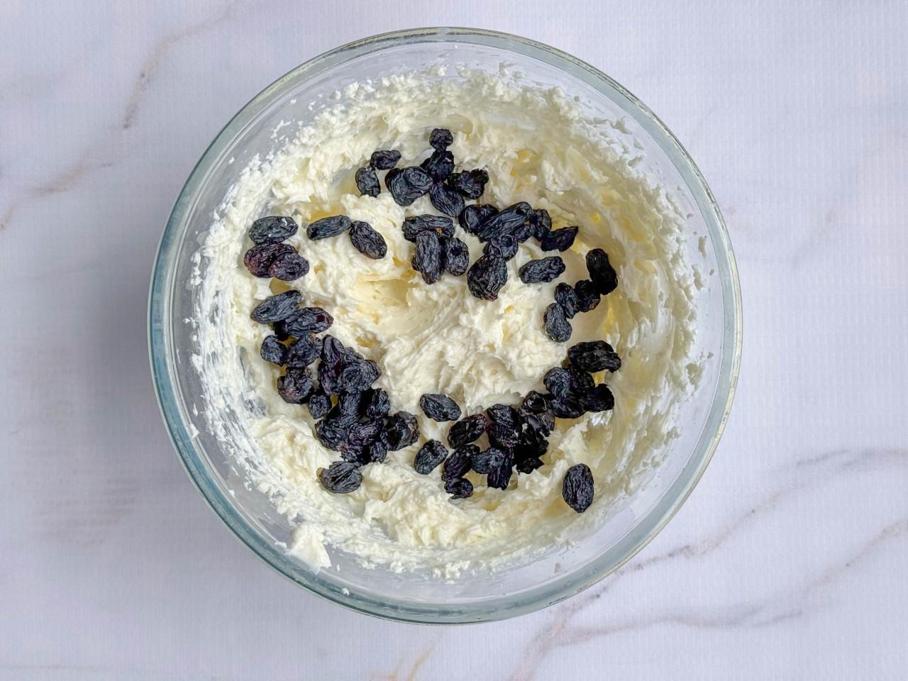 Изюм промойте и залейте кипятком на 1-2 минуты. Затем слейте воду, а изюм выложите на бумажное или вафельное полотенце, чтобы просушить его.Шаг 3. Как сделать основу для творожной массы?