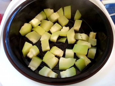 Кабачок я хорошо помыла, очистила и нарезала на кусочки. Готовить решила в мультиварке на пару. Это очень просто, быстро и не отнимает времени. Воды в чашу налила 1,5 стакана (холодной). Включила режим «пар» на 30 минут. По истечении времени наколола кусочки кабачка вилкой, они оказались мягкими. Тут же горяченьким пюрировала кабачок погружным блендером.