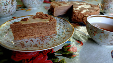 Вот такой он в разрезе. Очень хорошо пропитывается за ночь. Получается нежным, не очень сладким.Не имеет ни ярко выраженного вкуса меда, ни шоколада. Вкусы смешиваются и получается очень интересный тортик. Надеюсь,всем понравится.