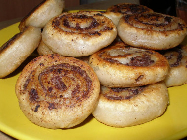 Сворачиваем тесто в рулет, края защипываем, нарезаем на куски по 2 см в толщину.