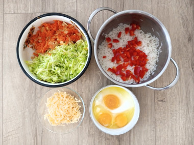 Тертый кабачок хорошо отожмите от сока, добавьте в общую массу. Также выложите обжаренные овощи. По желанию можно добавить по вкусу пропущенный через пресс чеснок.