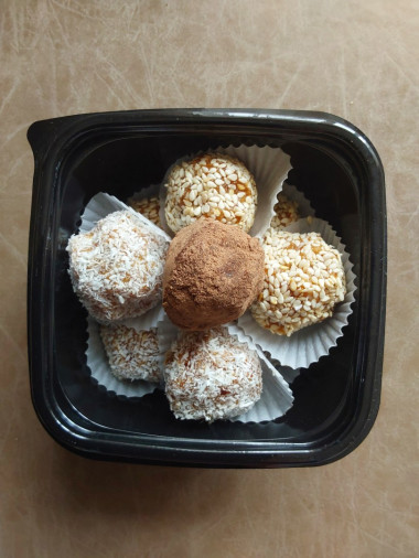 Мокрыми руками сформируйте конфеты. Вы можете оставить конфеты так, либо обвалять их в: какао, кокосовой стружке и кунжуте, как это сделала я. Кунжут я заранее обжарила до карамельного цвета.